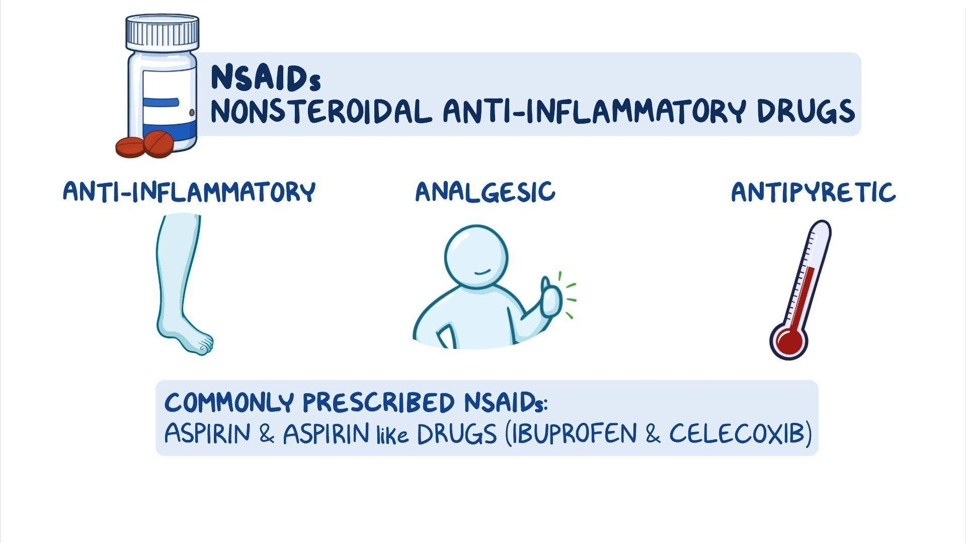 NSAIDs are a group of medications designed to relieve pain (analgesic effect), reduce inflammation (anti-inflammatory effect), and decrease fever (antipyretic effect).Read more